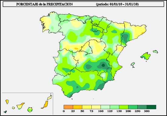 04/02/2010  Enero ha sido un mes muy húmedo, con un valor medio de la precipitación acumulada de 95 mm, lo que representa un 43% más que el valor normal del período de referencia 1971-2000. Las temperaturas se han situado en torno a su valor medio normal.