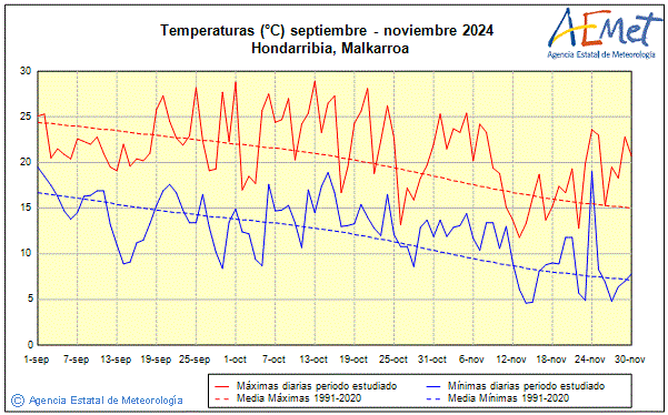 En los gráficos estacionales se muestra la evolución de las variables meteorológicas a lo largo de una estación climatológica determinada junto con la evolución de la normal del periodo 1991-2020 de la misma variable en la misma estación.