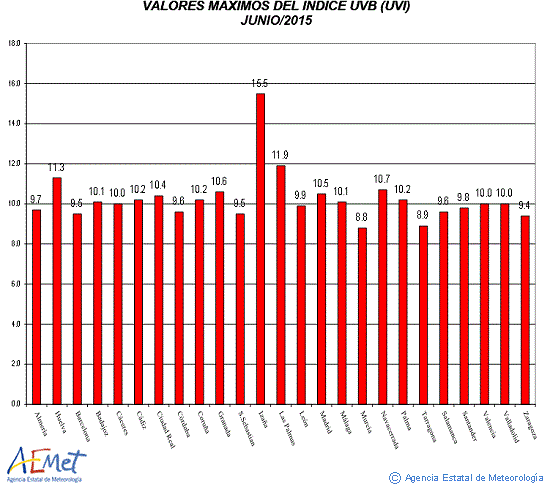 El máximo UVI registrado en junio (datos minutales) fue de 15.5 en el Observatorio Atmosférico de Izaña en Tenerife (a 2.371 m de altitud) y de 11.9 en Maspalomas (Gran Canaria). En las estaciones peninsulares, se alcanzó un máximo de 11.3 en El Arenosillo (Huelva), en el observatorio del puerto de Navacerrada (a 1.894 m de altitud) se dio un UVI de 10.6 y 10.6 en Granada. La media de las máximas en la Península y Baleares de este mes ha sido de 10.0.