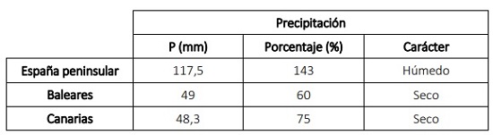 Diciembre ha sido entre húmedo y muy húmedo en casi toda la Península, llegando a ser extremadamente húmedo en puntos de Extremadura y la Comunidad de Madrid, así como las islas canarias occidentales. En contraste, diciembre ha sido entre normal y seco en la cornisa cantábrica, noreste de Cataluña y el levante peninsular, así como el archipiélago balear y las islas canarias orientales.