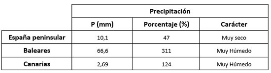 La mayor precipitación diaria registrada en observatorios principales correspondió a Ibiza/aeropuerto, que registró 72,3 mm el día 3. En cuanto a la precipitación total del mes, entre las estaciones principales, destacan los 158,1 mm de Hondarribia/Malkarroa.