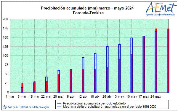 Para la precipitación se representa, mediante un diagrama de barras, la evolución de la precipitación acumulada en la estación climatológica junto con la evolución de la mediana de la precipitación acumulada en el periodo 1991-2020.