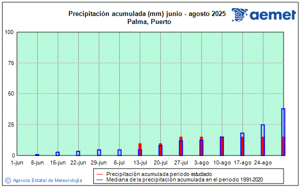 Para la precipitación se representa, mediante un diagrama de barras, la evolución de la precipitación acumulada en la estación climatológica junto con la evolución de la mediana de la precipitación acumulada en el periodo 1991-2020.