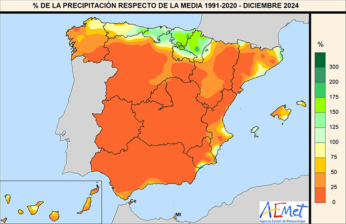Diciembre fue entre seco y muy seco en casi todo el territorio peninsular y Baleares, excepto en la cornisa cantábrica, donde el mes fue entre normal y húmedo, al igual que en puntos más aislados del área mediterránea. En el archipiélago canario fue seco en conjunto, aunque en las islas occidentales hubo zonas con un carácter húmedo.